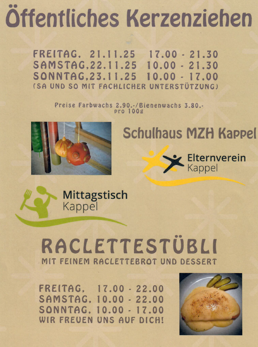 Vom 21. bis 23. November 2025 findet wieder das öffentliche Kerzenziehen im Schulhausareal in Kappel statt. Alle sind herzlich eingeladen, teils unter fachkundiger Anleitung, selber eine schöne Kerze zu ziehen.